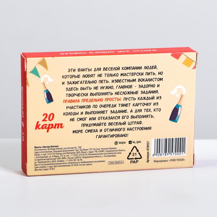 Купить игра для компании "фанты звезда бокала" 20 карт от 120 руб. с доставкой до пункта выдачи в Усолье. Интернет магазин ДекаМаркет. Оплата при получении.